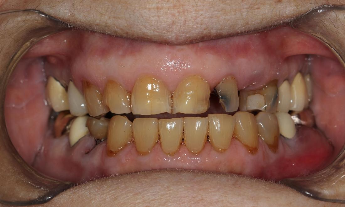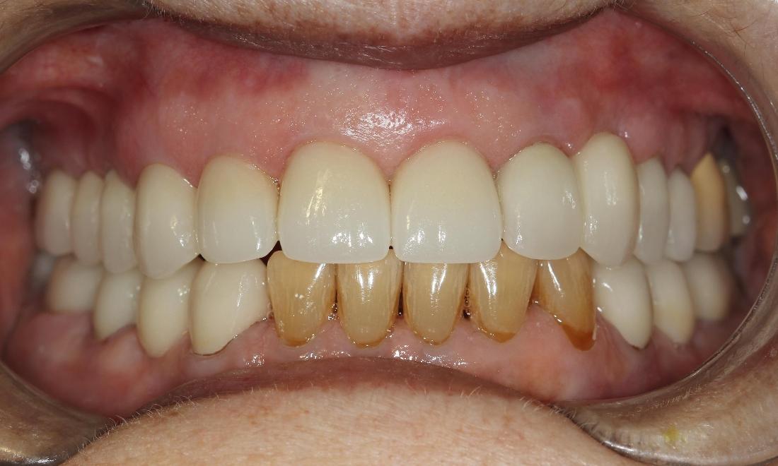 Patient presents to our office with generalized decay and broken teeth. Nearly a full-mouth rehabilitation. Patient only wanted to treat problem teeth so lower front teeth were untouched. Rebuilt patient's smile and she was thoroughly impressed and satisfied with functionality and esthetics.