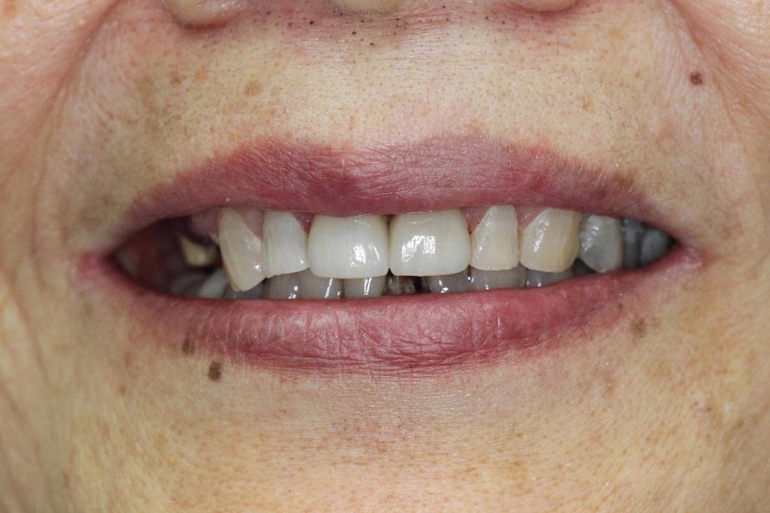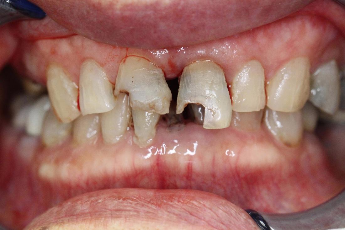 Patient had severe decay on front teeth and broke while eating. We were able to save her teeth by removing her decay, building up all the compromised structure, and replace the two front teeth with crowns.
