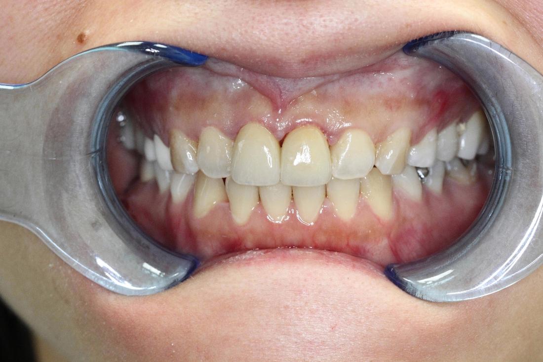 Patient presents with decay underneath her existing large fillings in her front teeth. Old restoration and decay was removed and replaced by crowns. We were also able to use this opportunity to straighten her two front teeth by use of crowns as an added benefit.
